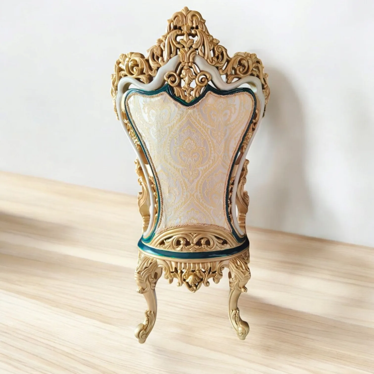 Command attention and elevate any space with this Luxurious Baroque Throne Chair, a statement piece designed for those with a taste for opulence. Hand-carved from solid wood and finished in radiant antique gold, this chair showcases intricate detailing throughout the frame, including scrollwork, floral motifs, and regal lion accents. The high-back silhouette is upholstered in a sumptuous damask-patterned brocade fabric, featuring soft gold and ivory tones with rich emerald green trim for a striking contrast. Perfect for formal settings, photoshoots, luxury lobbies, or as a dramatic accent piece in your home.