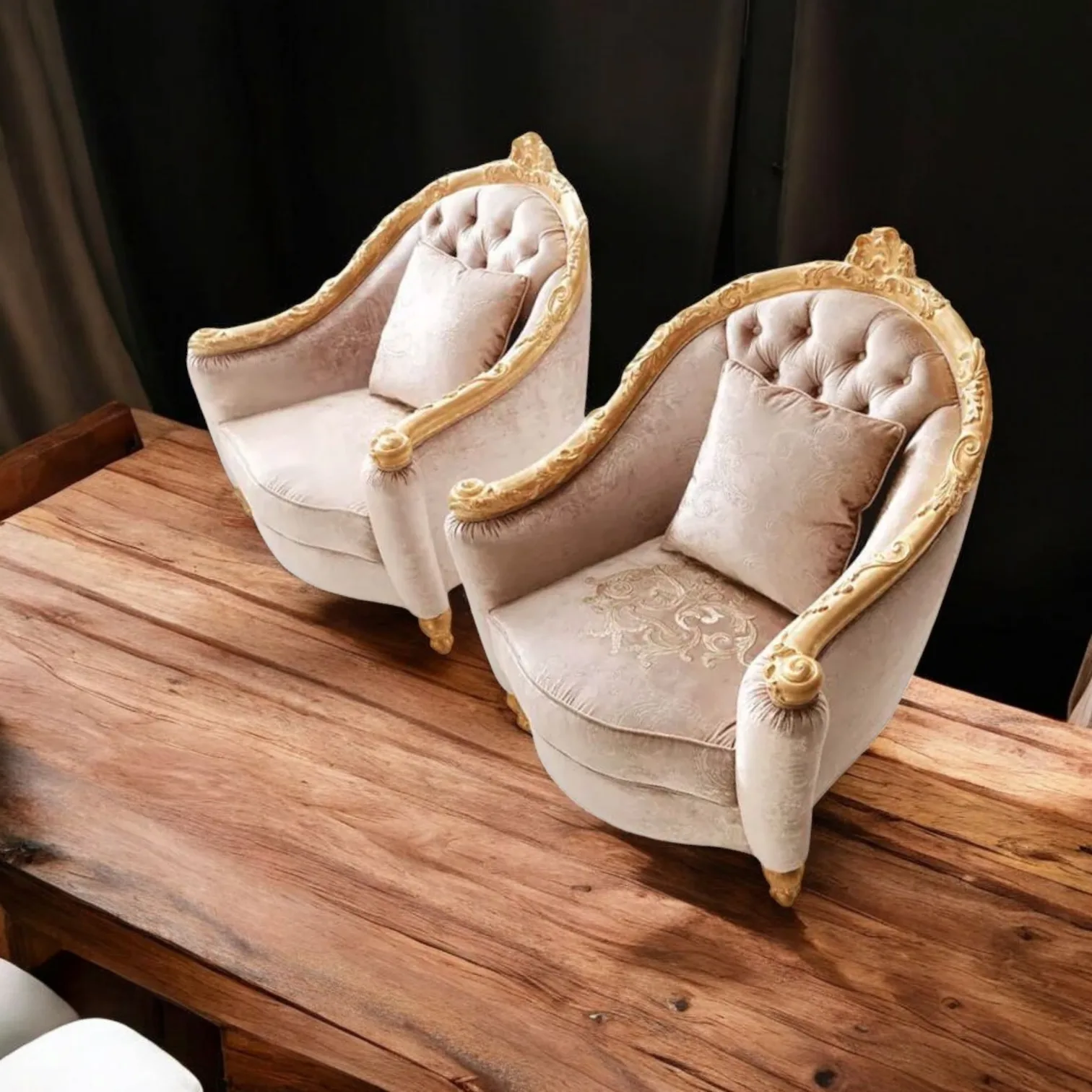 Transform your living space into a palace of elegance with this Luxury Victorian-Inspired Velvet Sofa Set, where classic grandeur meets modern sophistication. Crafted with ornate gold detailing and upholstered in plush, tufted velvet, this stunning 5-piece set includes a grand 3-seater sofa, two matching armchairs, a tufted ottoman-style coffee table, and coordinating accent pillows. With its regal curves, carved wooden legs, and soft neutral tones, this set is the epitome of timeless luxury—perfect for formal sitting rooms or high-end interiors.